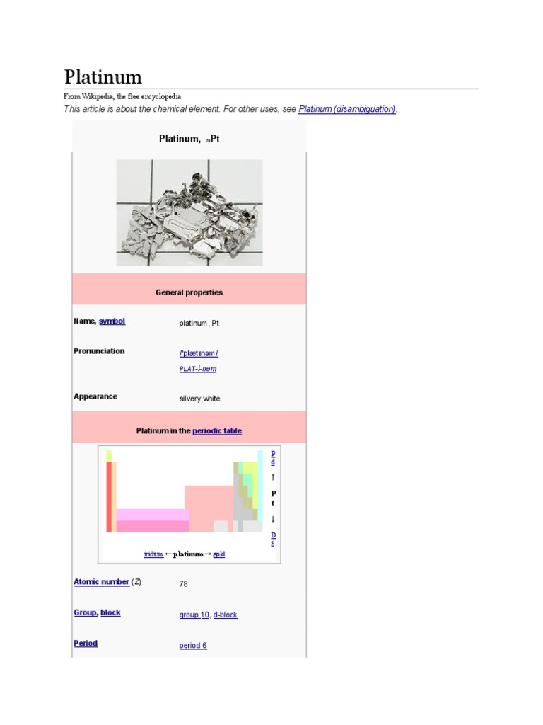 This article is about the chemical element. For other uses, see Platinum (disambiguation).
