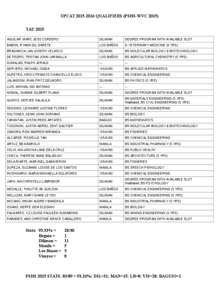 PSHS 2015 STATS: 83/89 = 93.26%; DIL=31; MAN=15; LB=8; VIS=28; BAGUIO=1