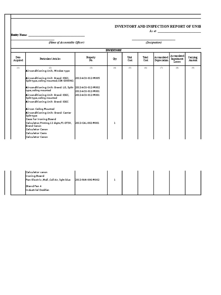INVENTORY AND INSPECTION REPORT OF UNSERVICEABL