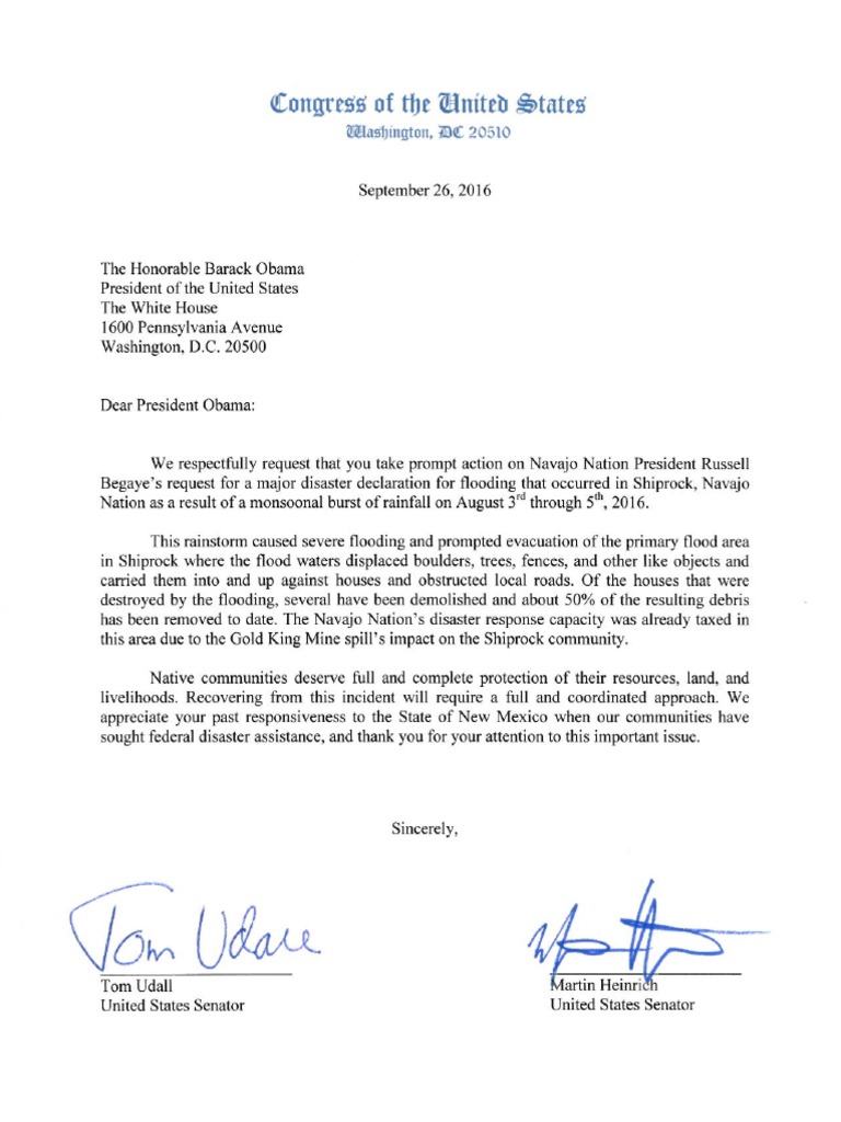 In a letter to the President of the United States, U.S. Senators Tom Udall and Martin Heinrich and U.S. Representatives Steve Pearce, Ben Ray Luján and Michelle Lujan Grisham expressed support for Navajo Nation President Russell Begaye’s request for a major disaster declaration in response to August flooding that occurred on the Navajo Nation in Shiprock.