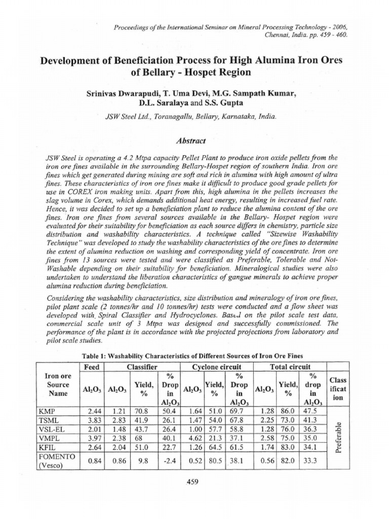 Development of Beneftciation Process for High Alumina Iron Ores of Bellary - Hospet Region