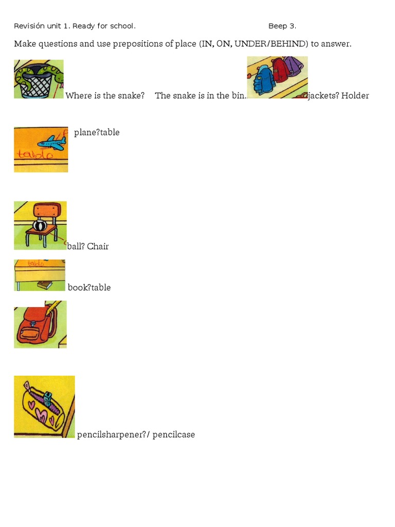 Make questions and use prepositions of place (IN, ON, UNDER/BEHIND) to answer.