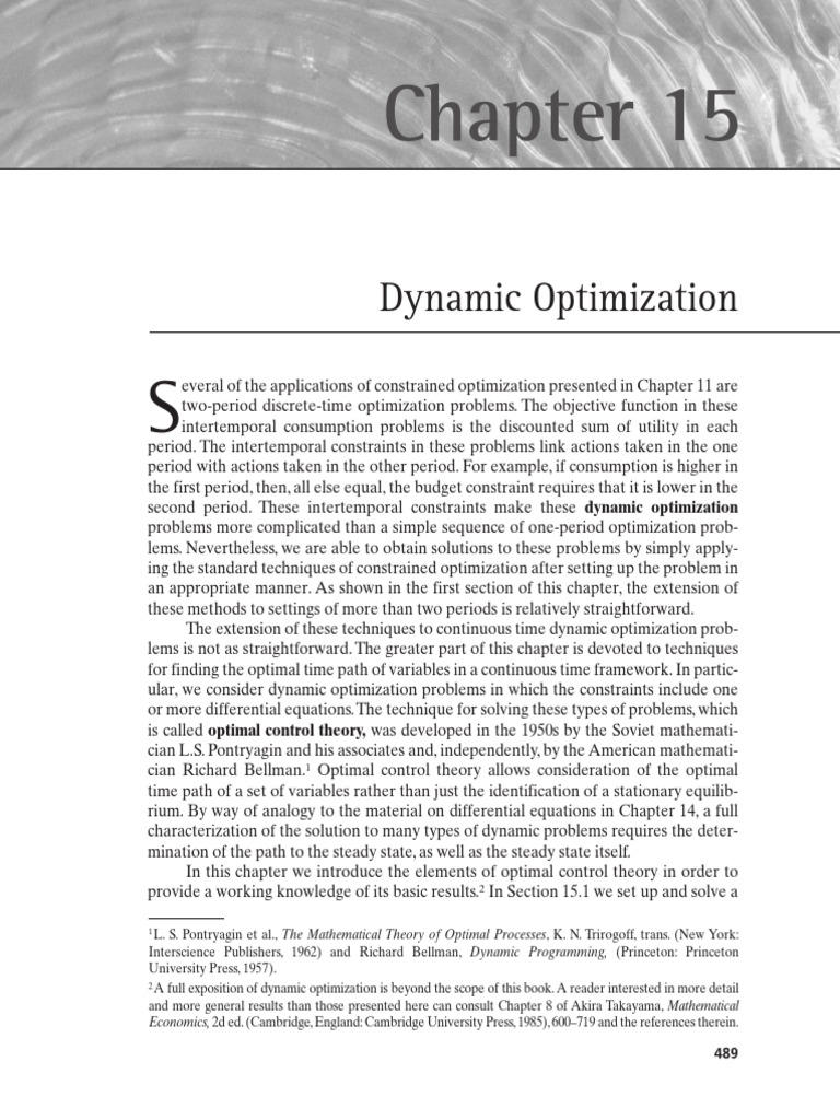 applications. An appendix to the chapter presents a heuristic derivation of the necessary conditions for a continuous time dynamic optimization problem.
