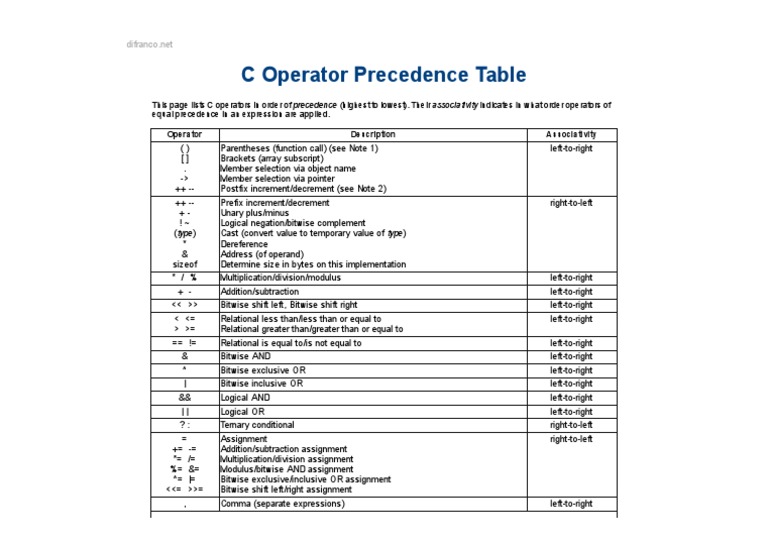 ThispagelistsCoperatorsinorderofprecedence(highesttolowest).Theirassociativityindicatesinwhatorderoperatorsof