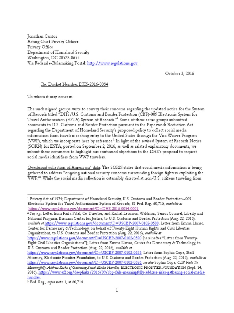 https://www.regulations.gov/document?D=USCBP-2007-0102-0590 [hereinafter Letter from TwentyEight Civil Liberties Organizations]; Letter from Emma Llanso, Center for Democracy & Technology, to