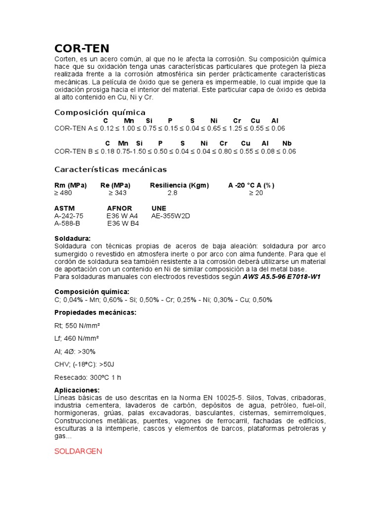 Corten, es un acero comn, al que no le afecta la corrosin. Su composicin qumica