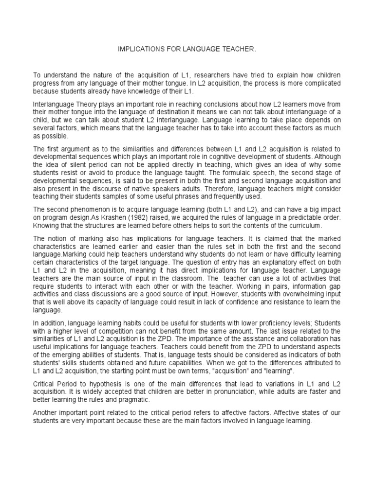 L1 and L2 in the acquisition, meaning it has direct implications for language teacher. Language