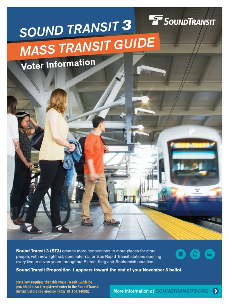 State law requires that this Mass Transit Guide be provided to each registered voter in the Sound Transit District before the election (RCW 81.104.140(8)).