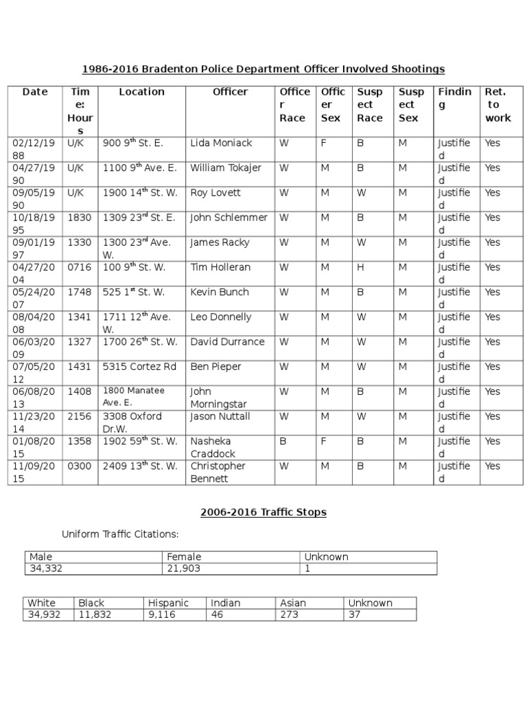 City of Bradenton officer-involved shootings between 1986 and 2016 and traffic stops between 2006 and 2016