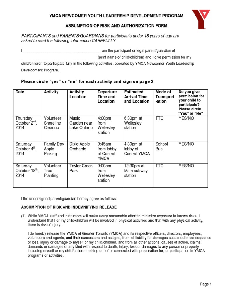 child/children to participate fully in the following activities, operated by YMCA Newcomer Youth Leadership