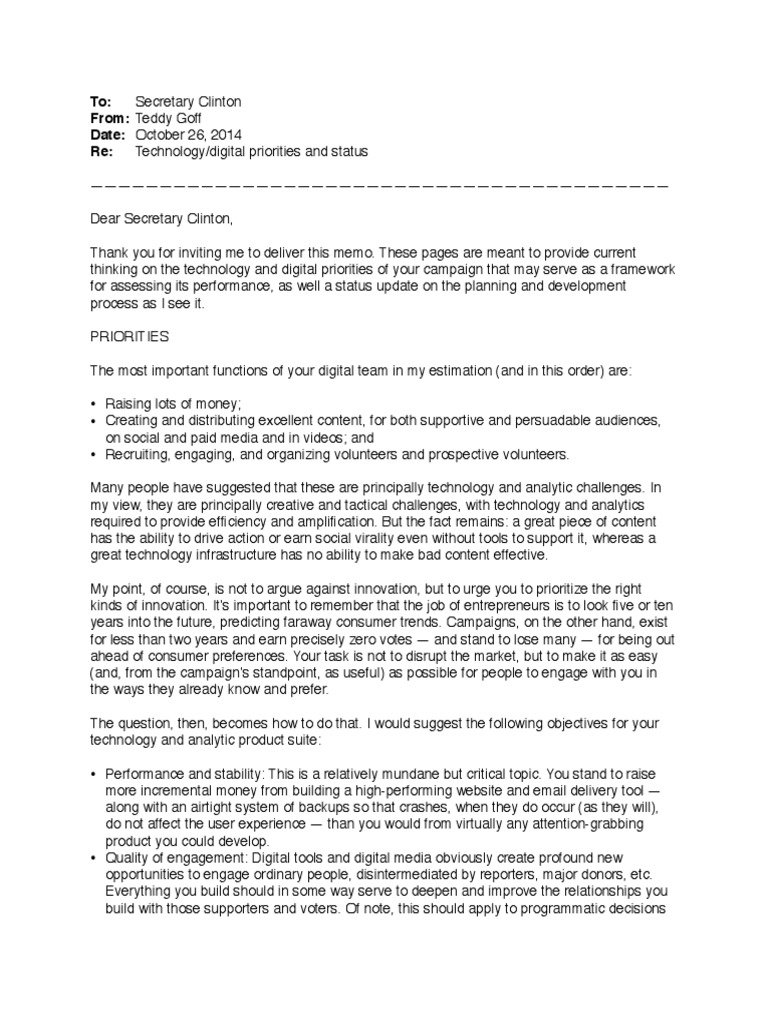 Thank you for inviting me to deliver this memo. These pages are meant to provide current thinking on the technology and digital priorities of your campaign that may serve as a framework for assessing its performance, as well a status update on the planning and development process as I see it. PRIORITIES