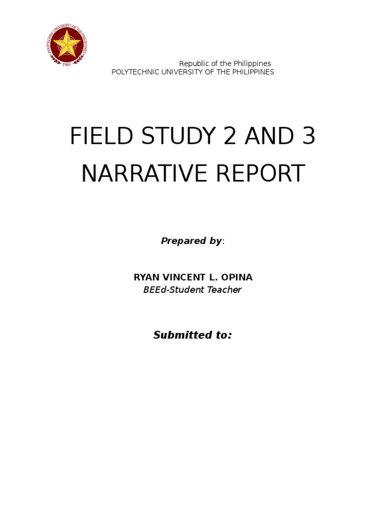 The document is a narrative report from a student teacher at the Polytechnic University of the Philippines about their field study 2 and 3. It provides details about their experiences teaching in a classroom setting and interacting with students to help develop their skills as an educator. The report summarizes the lessons learned and how they have grown professionally over the course of their field work.