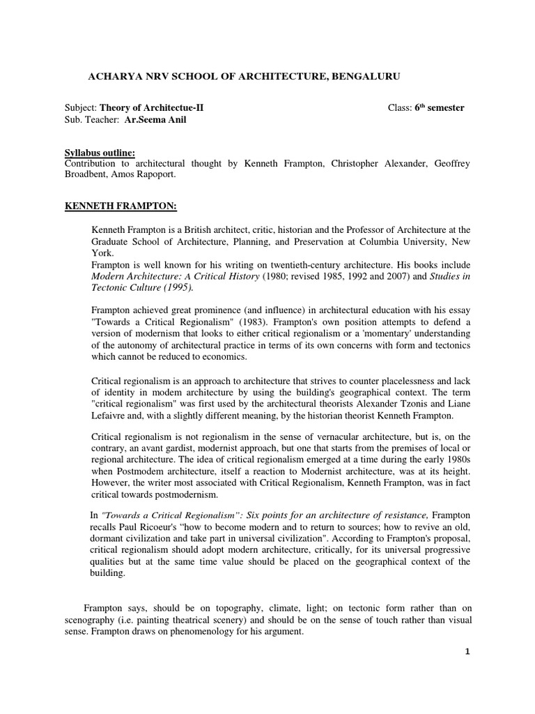 "Towards a Critical Regionalism" (1983). Frampton's own position attempts to defend a