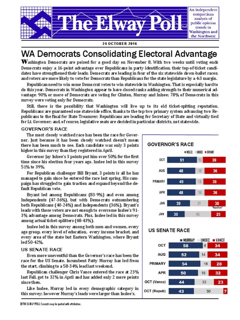 ashington Democrats are poised for a good day on November 8. With two weeks until voting ends Democrats enjoy a 16-point advantage over Republicans in party identiication; their top-of-ticket candi-dates have strengthened their leads; Democrats are leading in four of the six statewide down-ballot races; and voters are more likely to vote for Democrats than Republicans for the state legislature by a 4:3 margin. Republican need to win some Democrat votes to win statewide in Washington. That is especially hard to do this year. Democrats in Washington appear to have closed ranks adding strength to their numerical ad-vantage: 90% or more of Democrats are voting for Clinton, Murray and Inlsee; 78% of Democrats in this survey were voting only for Democrats. Still, there is the possibility that Washington will live up to its old ticket-spitting reputation. Republicans are guaranteed one statewide ofice, thanks to the top two primary system advancing two Re-publicans to the inal for State Treasurer; Republicans are leading for Secretary of State and virtually tied for Lt. Governor; and, of course, legislative seats are decided in particular districts, not statewide.