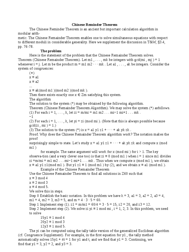 metic. The Chinese Remainder Theorem enables one to solve simultaneous equations with respect