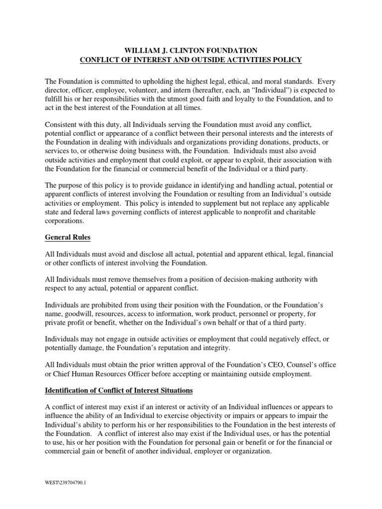 Participation by an Individual in any outside employment or business activity, financial or otherwise, that conflicts or appears to conflict with the interests of the Foundation or interferes with the Individual’s duties and responsibilities at the Foundation as determined by the Foundation.