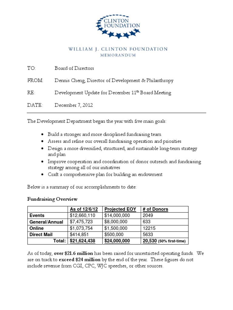 TO: Board of Directors FROM: Dennis Cheng, Director of Development & Philanthropy RE: Development Update for December 11