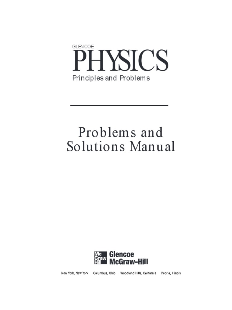 Physics: Principles and Problems is a textbook that covers introductory physics concepts. It aims to help students understand key principles through worked examples and practice problems. The accompanying Solutions Manual provides step-by-step solutions to the problems presented in the textbook to help guide students in learning the material and verifying their work.