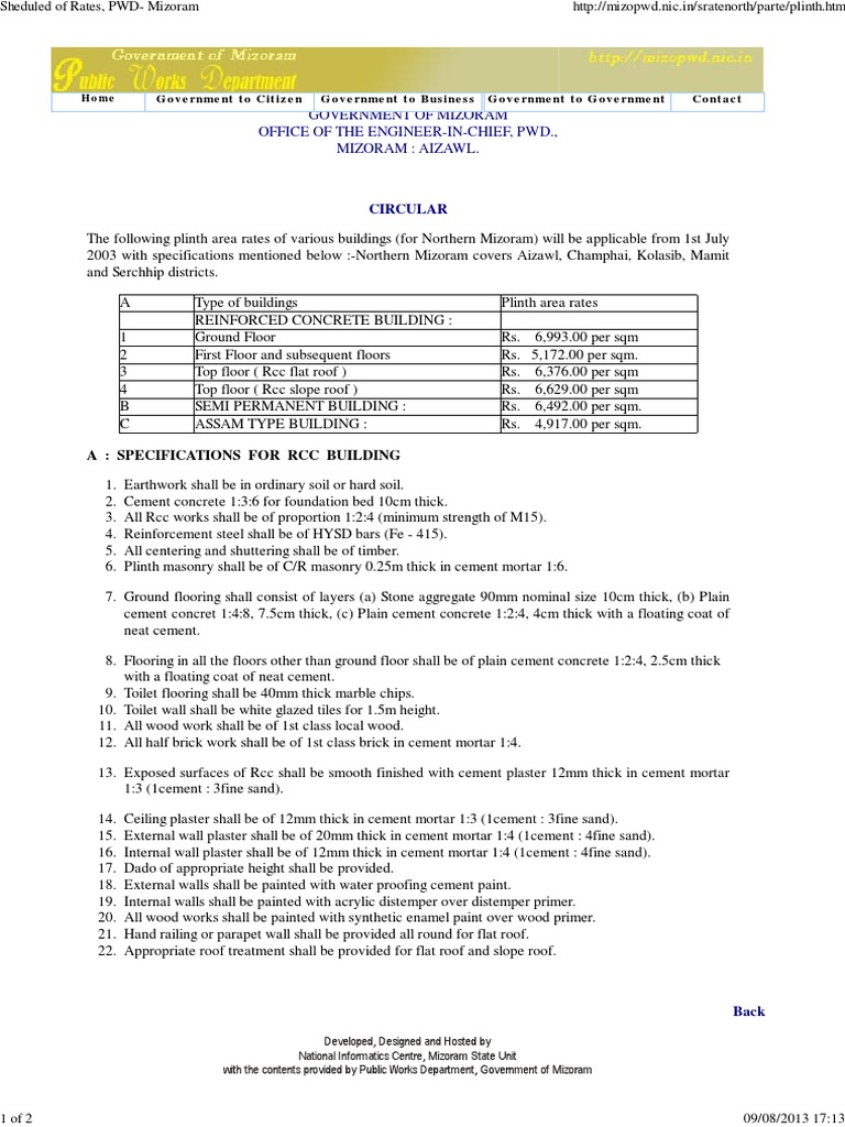 The following plinth area rates of various buildings (for Northern Mizoram) will be applicable from 1st July