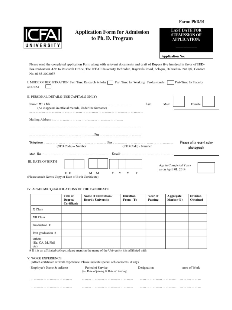 Please send the completed application Form along with relevant documents and draft of Rupees five hundred in favor of IUDFee Collection A/C to Research Office, The ICFAI University Dehradun, Rajawala Road, Selaqui, Dehradun- 248197, Contact