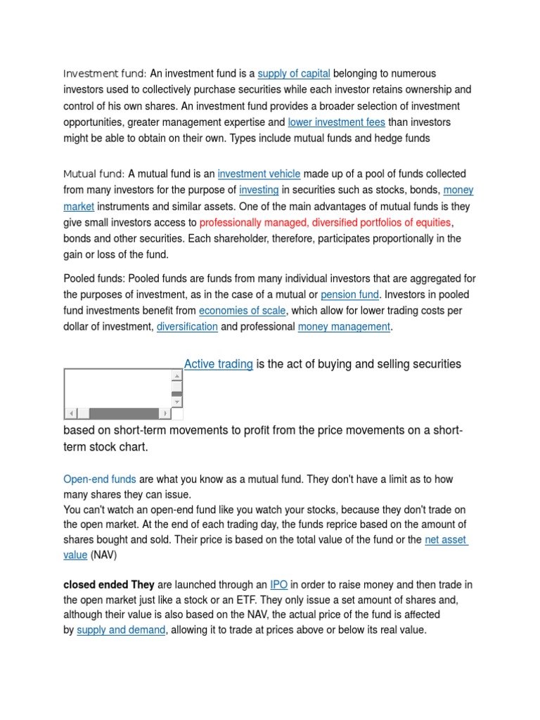 Investment fund: An investment fund is a supply of capital belonging to numerous