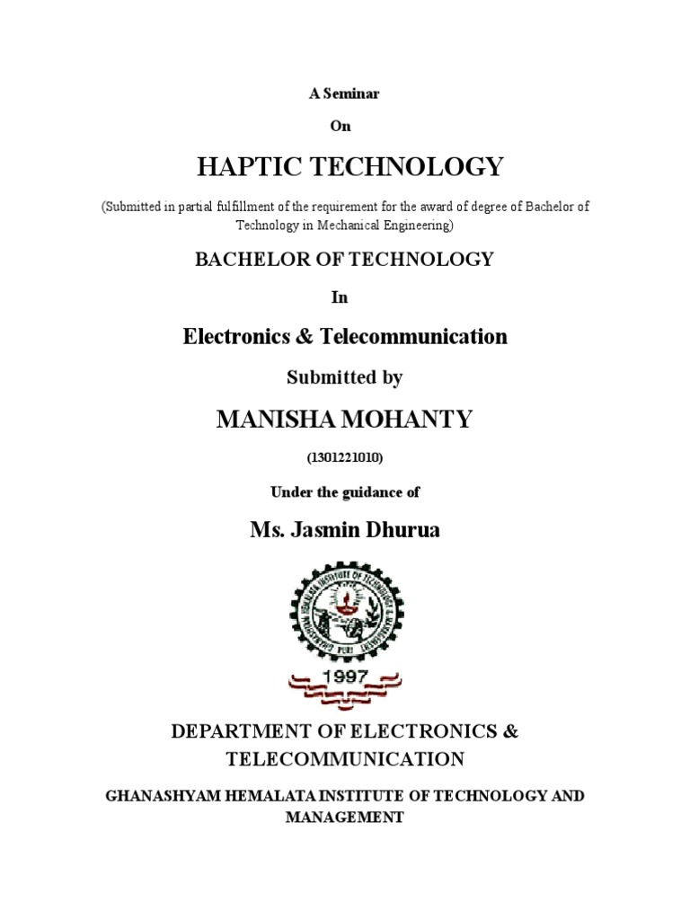 Seminar Report entitled HAPTIC TECHNOLOGY ,in practical