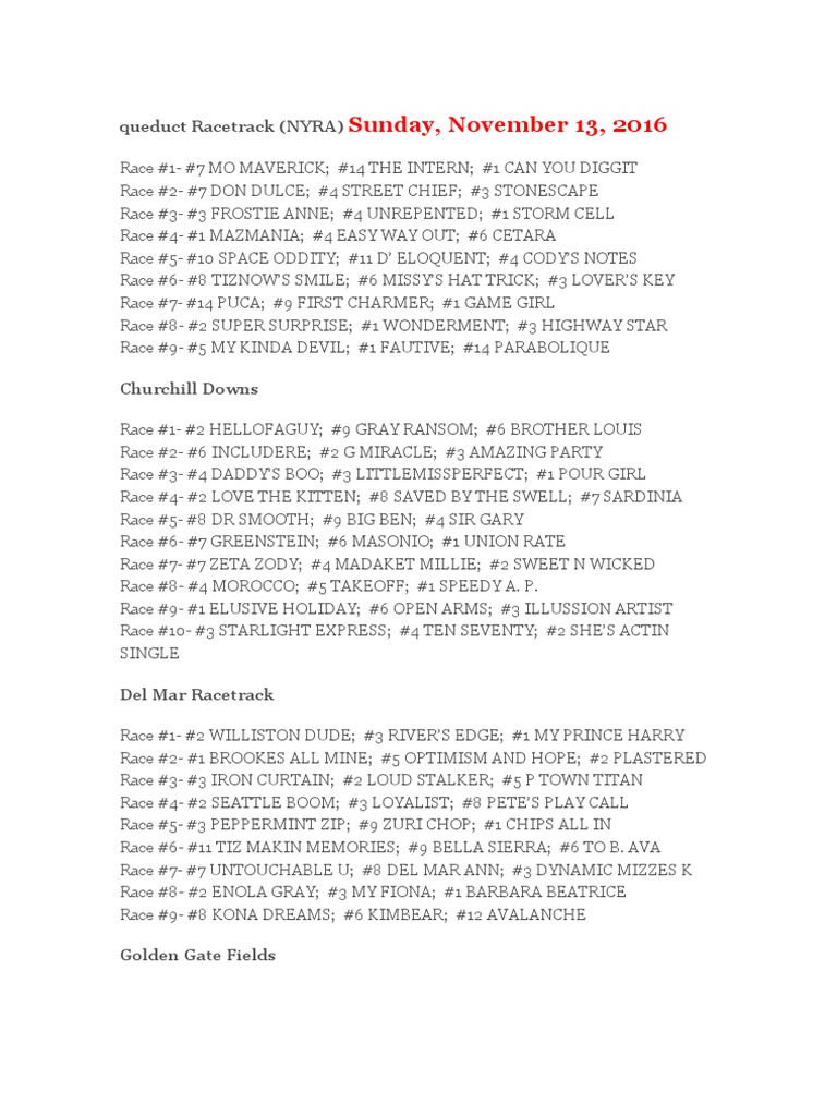 queduct Racetrack (NYRA) Sunday,