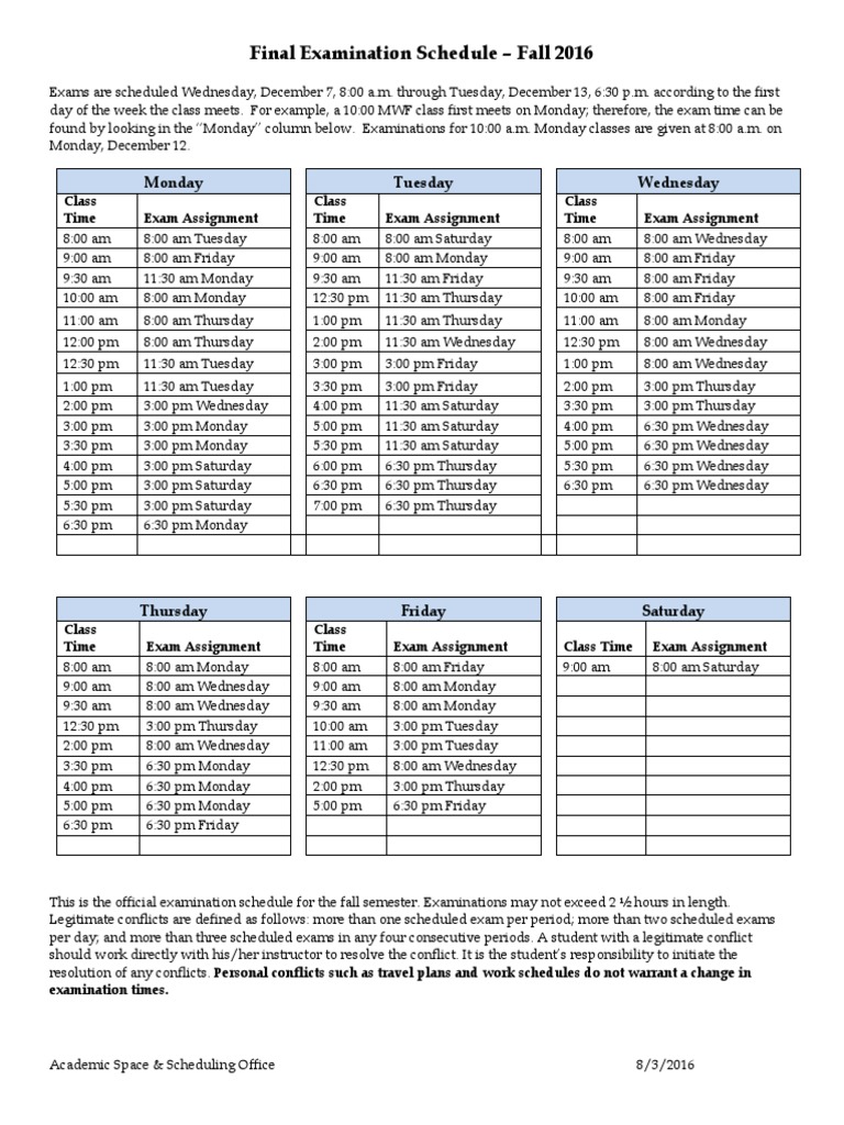 This is the official examination schedule for the fall semester. Examinations may not exceed 2 hours in length.