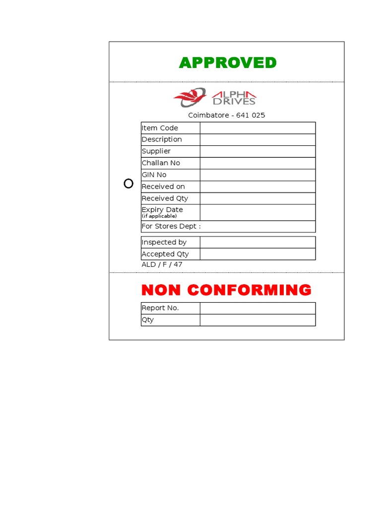 The document is a receipt for goods received by a stores department. It lists an item code, description, supplier details, delivery challan number, goods-in number, receipt date and quantity, and any expiry date. There is a section for the stores department to inspect the goods and record the accepted quantity, or note any non-conforming goods along with a report number and quantity.