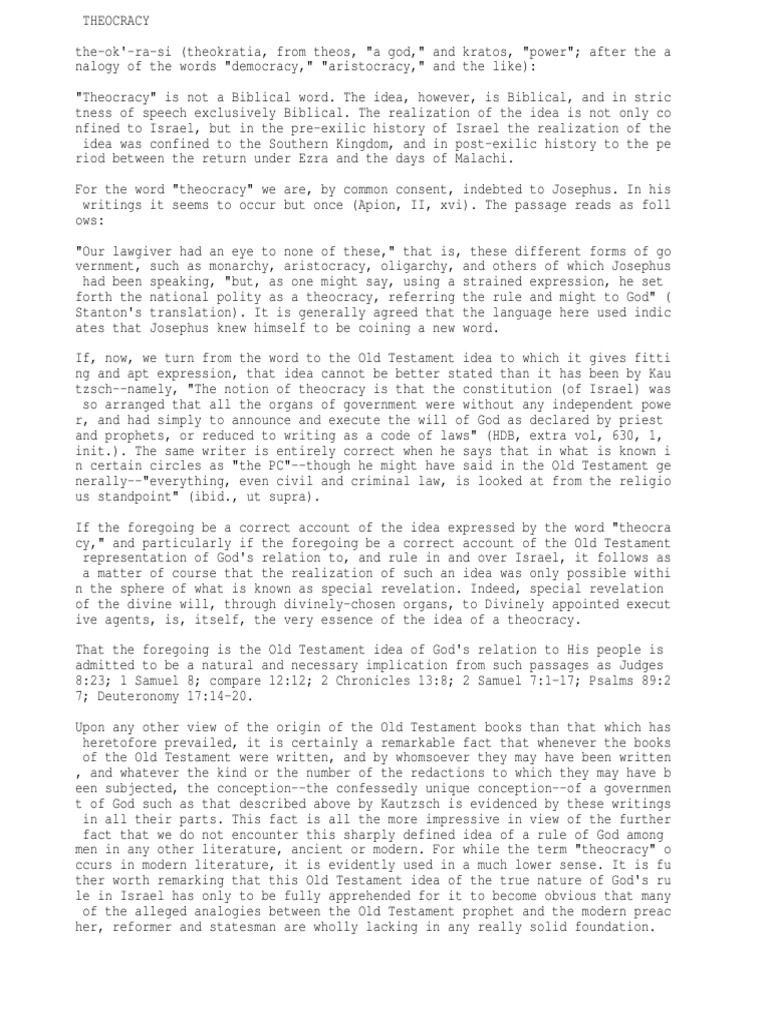 Orr, James, M.A., D.D. General Editor. "Entry for 'THEOCRACY'". "International S