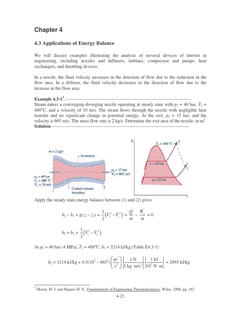 Example 4.3-13. ---------------------------------------------------------------------------------Steam enters a converging-diverging nozzle operating at steady state with p1 = 40 bar, T1 =