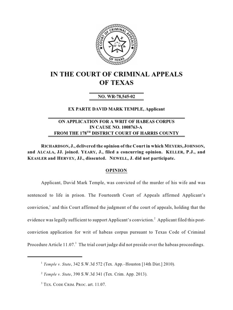 Applicant, David Mark Temple, was convicted of the murder of his wife and was