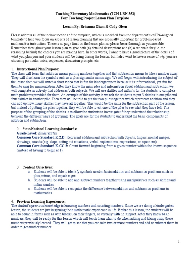 mathematics instruction. There is no page limit on the lesson plan so please be as thorough as you are able.