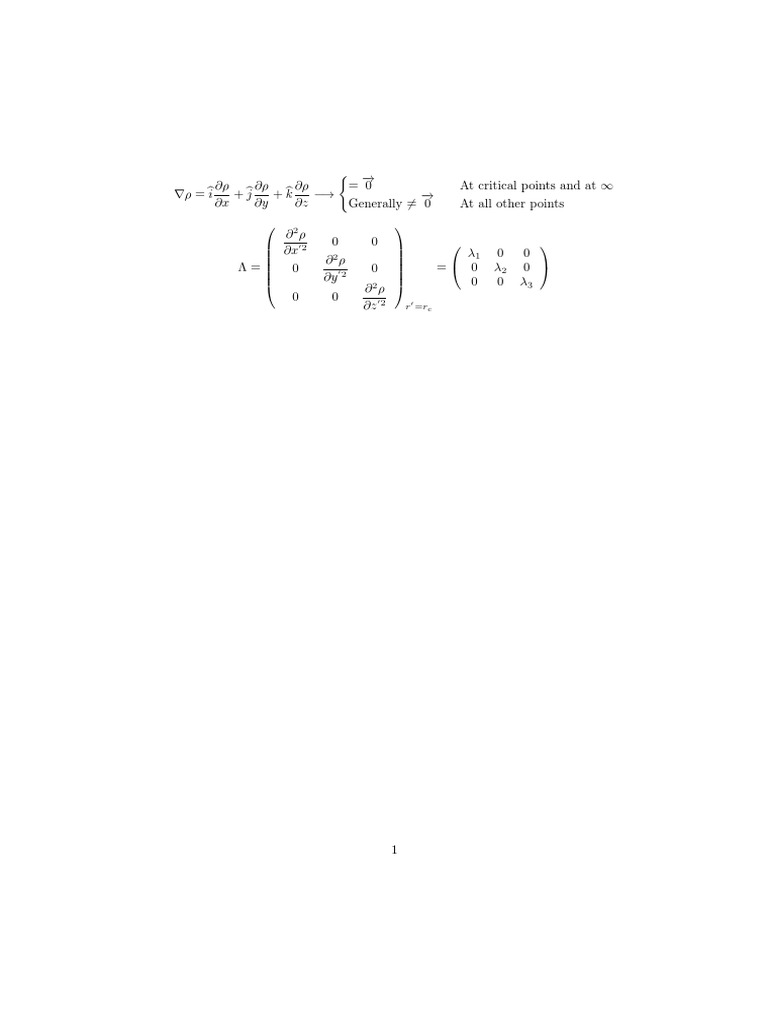 This document discusses the gradient of a function ρ and its Laplacian. The gradient of ρ is defined as the partial derivatives with respect to x, y, and z. The Laplacian of ρ is defined as the second partial derivatives and is represented by a matrix Λ. At critical points and infinity, the Laplacian is equal to 0, while at other points it is generally not equal to 0.