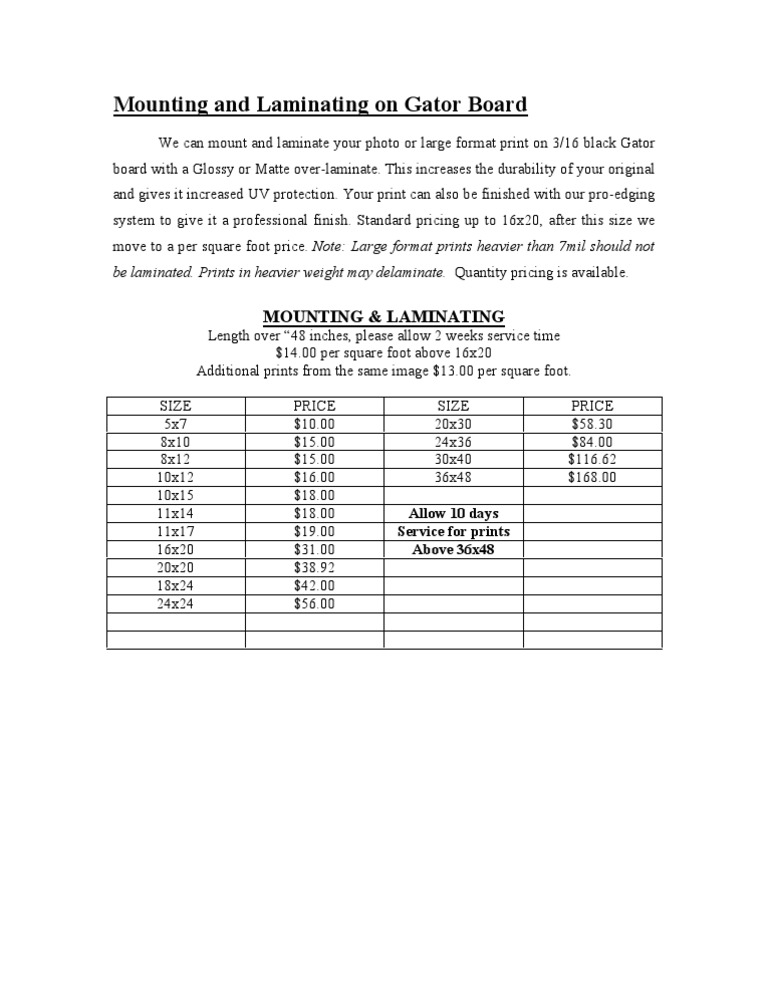 We can mount and laminate your photo or large format print on 3/16 black Gator