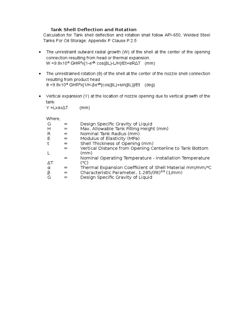 Calculation for Tank shell deflection and rotation shall follow API-650, Welded Steel
