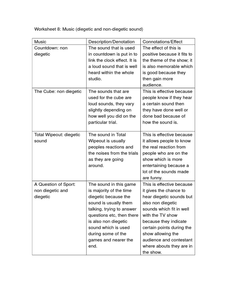 Worksheet 8: Music (diegetic and non-diegetic sound)