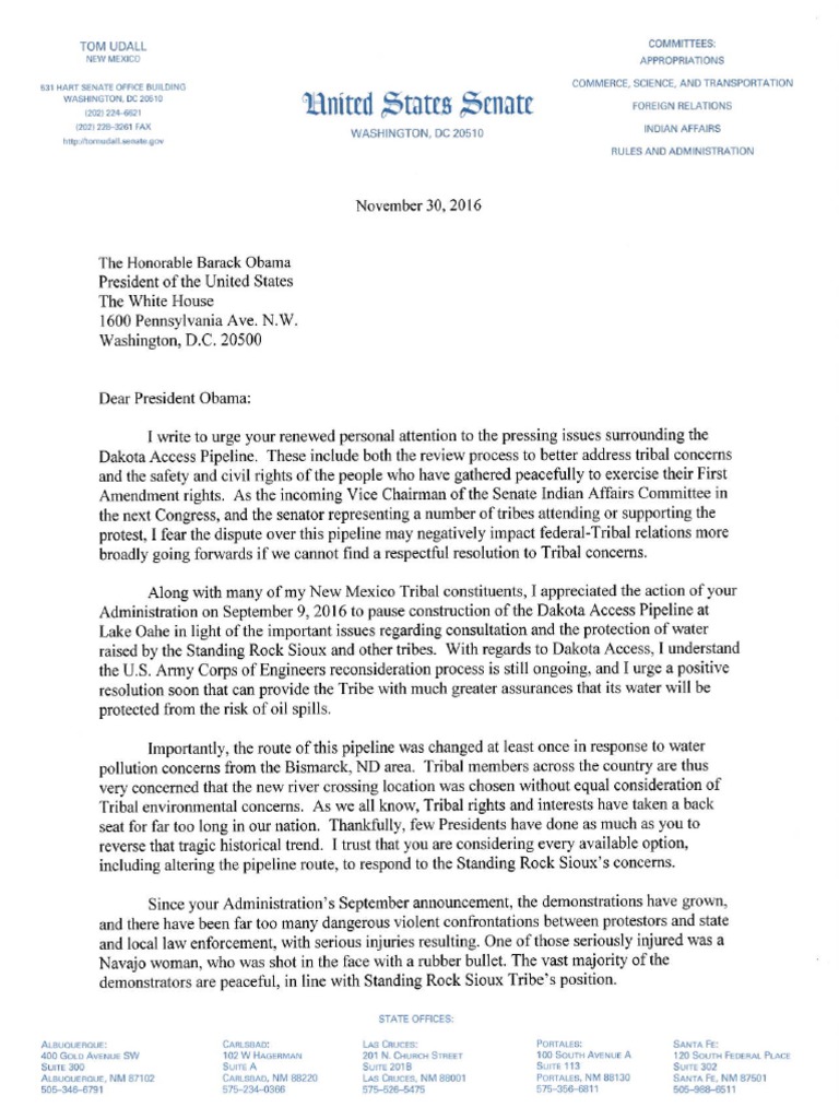U.S. Senator Tom Udall, incoming vice chairman of the Senate Indian Affairs Committee, condemned the violence against Tribal members and others protesting the Dakota Access Pipeline and called on President Barack Obama to take urgent action to protect the protesters and address their concerns about how the pipeline could harm the water quality near the Standing Rock Sioux reservation. In a letter, Udall urged the Obama administration and the U.S. Army Corps of Engineers to consider every available option to fully protect Tribal rights and land, including re-routing the pipeline.