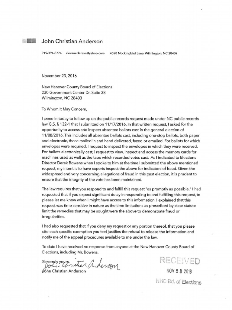 11-23-16 New Hanover North Carolina Records Request follow up letter John Anderson