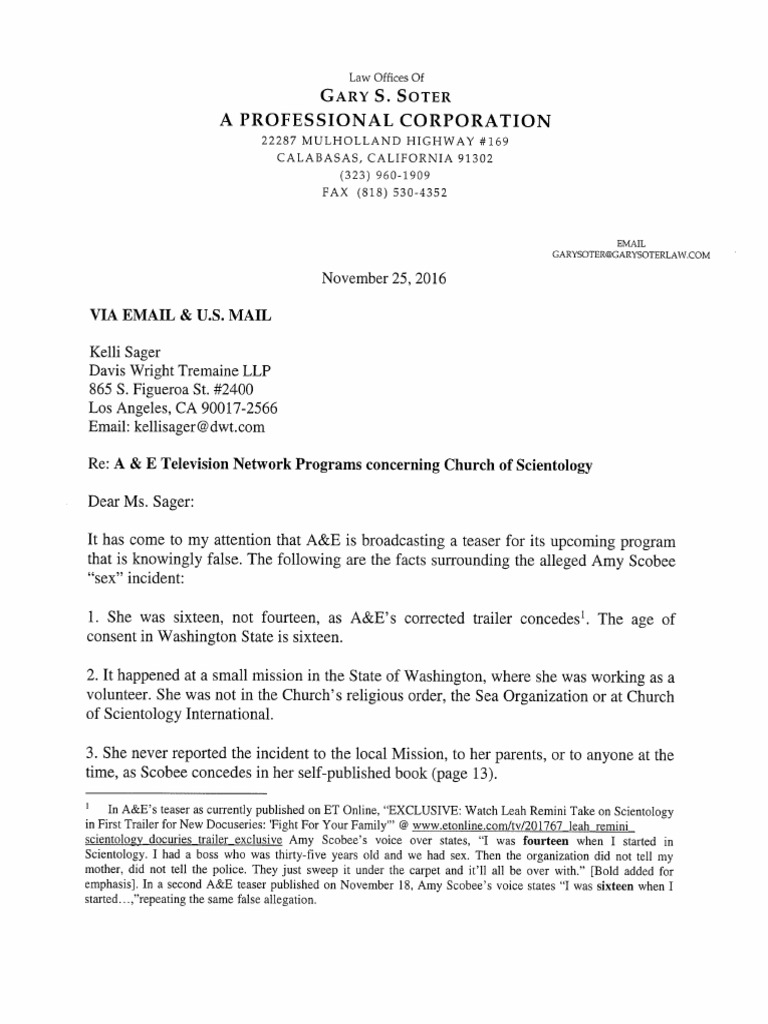 November 25, 2016 letter from Scientology lawyer Gary Soter to A&E attorney about Amy Scobee's rape claims.