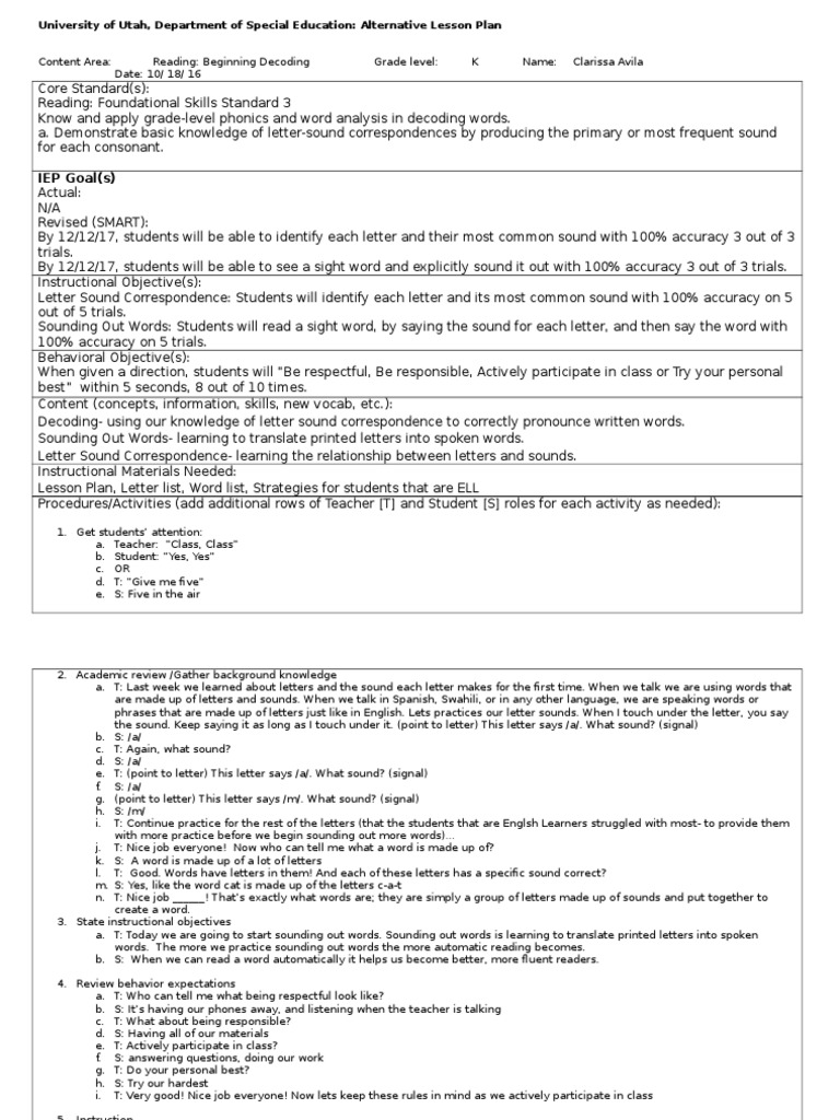 University of Utah, Department of Special Education: Alternative Lesson Plan