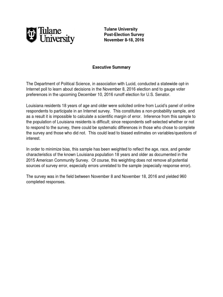 Tulane University Post-Election Survey November 8-18, 2016 Executive Summary