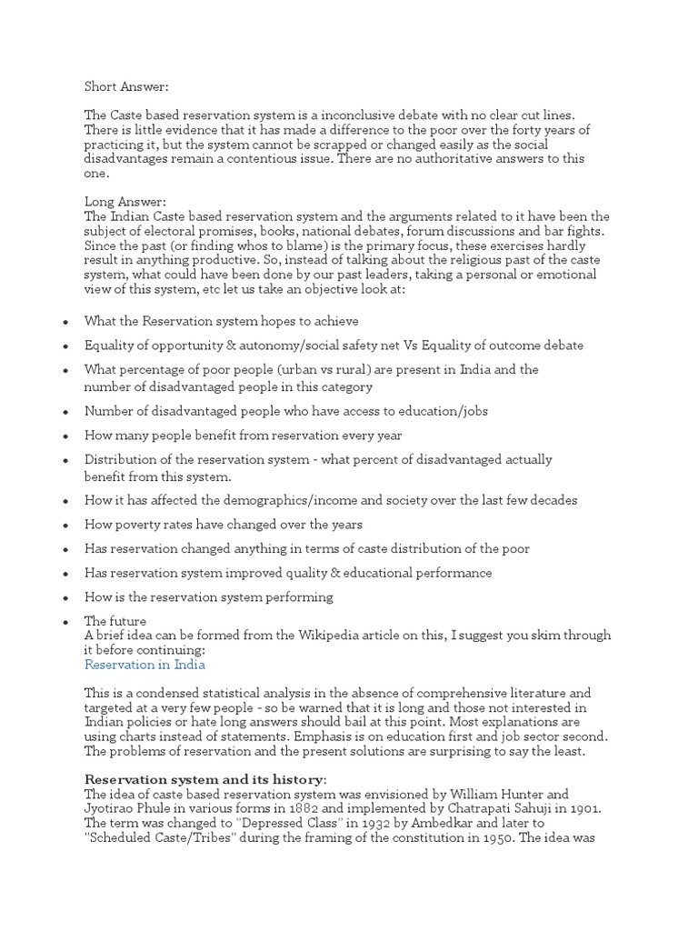 The Indian Caste based reservation system and the arguments related to it have been the