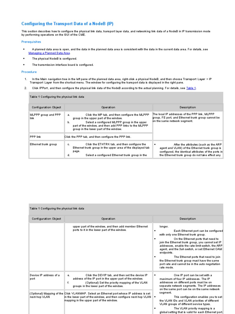 Configure the transport layer data of the NodeB in the configuration sequence shown in Table 2 according to the actual planning.