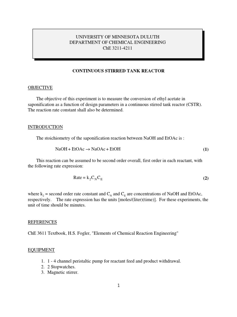 Refer to Figure 1 for a schematic of the CSTR apparatus. It consists of a 180 mL tall form