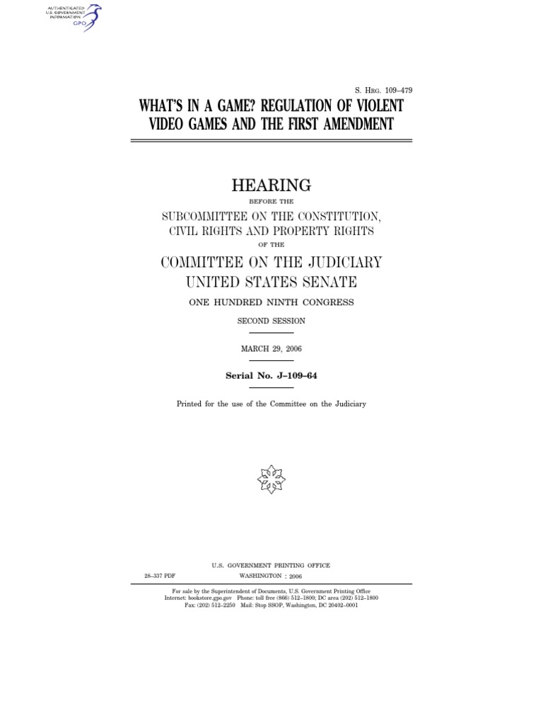 Brownback, Hon. Sam, a U.S. Senator from the State of Kansas.......................1Feingold, Hon. Russell D., a U.S. Senator from the State of Wisconsin.............3Kohl, Hon. Herbert, a U.S. Senator from the State of Wisconsin, prepared statement..............................................................................................................138WITNESSES Bickham, David S., Research Scientist, Center on Media and Child Health, Children’s Hospital Boston, Boston, Massachusetts.........................................12Carll, Elizabeth K., Chair, Interactive Media Committee, Media Psychology Division, American Psychological Association, Long Island, New York..........7Johnson, Hon. Jeff, Assistant Majority Leader, Minnesota House of Rep-resentatives, Plymouth, Minnesota....................................................................23Saunders, Kevin W., Professor of Law, Michigan State University, East Lan-sing, Michigan......................................................................................................29Smith, Paul M., Jenner and Block LLP, Washington, D.C..................................27Strickland, Steve, Reverend, Fayette County, Alabama......................................5 Vance, Patricia E., President, Entertainment Software Rating Board, New York, New York....................................................................................................22Williams, Dmitri, Assistant Professor, Department of Speech Communication, University of Illinois at Urbana-Champaign, Urbana, Illinois........................10SUBMISSIONS FOR THE RECORD American Center for Law & Justice, Jay A. Sekulow, Esq., Chief Counsel, Stuart J. Roth, Esq., Senior Counsel, Colby M. May, Esq., Director, Wash-ington Office, and Erik Zimmerman, Law Clerk, Washington, D.C., state-ment......................................................................................................................37 Andersen, Crossan R., President, Video Software Dealers Association, Encino, California, statement...........................................................................................57Bach, Robert J., President, Entertainment and Devices Division, Microsoft Corporation, Redmond, Washington, statement................................................64Bickham, David S., Research Scientist, Center on Media and Child Health, Children’s Hospital Boston, Boston, Massachusetts, statement......................66Calvert, Clay, Associate Professor of Communications and Law, Pennsylvania State University, State College, Pennsylvania, statement...............................72Carll, Elizabeth K., Chair, Interactive Media Committee, Media Psychology Division, American Psychological Association, Long Island, New York, state-ment and attachments.........................................................................................79Florida Police Chiefs Association, Tallahassee, Florida, resolution....................91Fraternal Order of Police, Mark Koch, President, Pensylvania State Lodge, Games and youth violence—independent research findings ignored by APA, Harrisburg, Pennsylvania, letter........................................................................92Gee, James Paul, Tashia Morgridge Professor of Reading, University of Wis-consin Madison, Madison, Wisconsin, statement..............................................100Goldstein, Jeffrey H., Department of Social & Organizational Psychology, Utrecht University, The Netherlands, statement..............................................110Horowitz, David, Executive Director of the Media Coalition, statement............127Interactive Entertainment Merchants Association, Hal Halpin, President, Wil-ton, Connecticut, statement................................................................................132Johnson, Hon. Jeff, Assistant Majority Leader, Minnesota House of Rep-resentatives, Plymouth, Minnesota, statement.................................................135