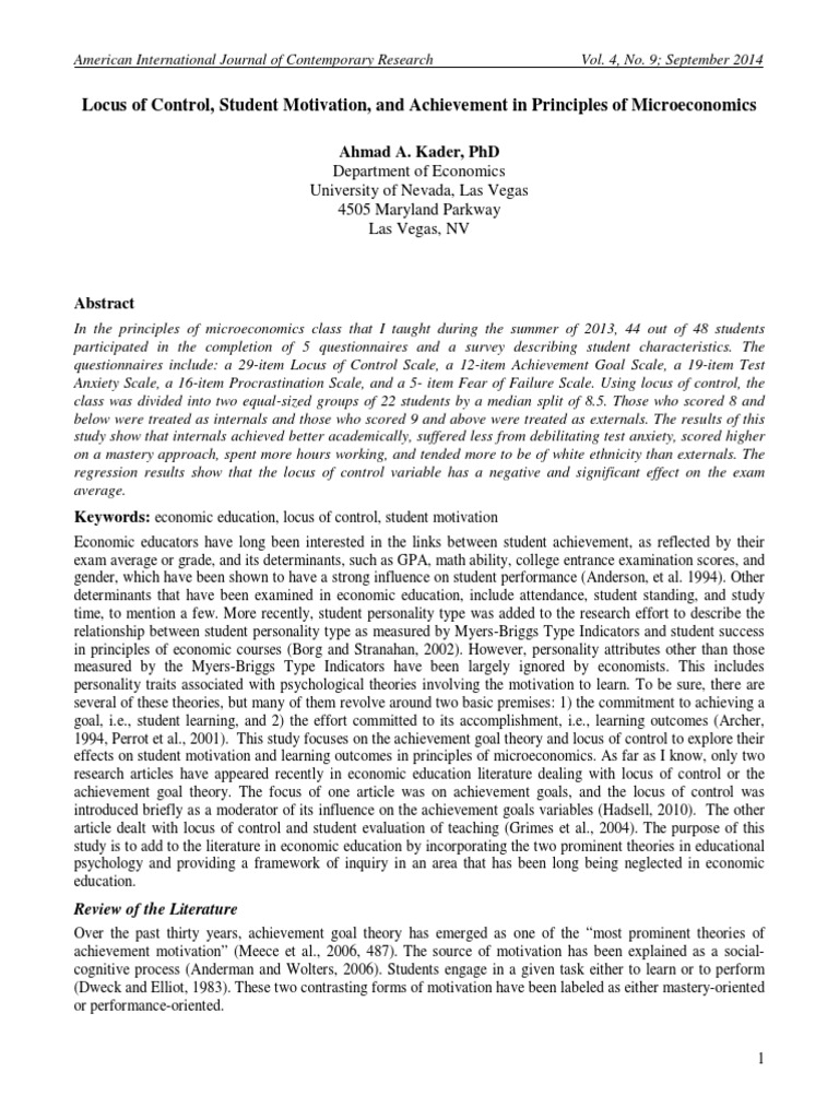 Hadsell, L. 2010. Achievement Goals, Locus of Control, and Academic Success in Economics, American