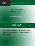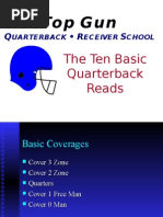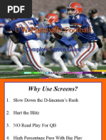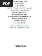 This document outlines an offensive playbook and philosophy for a spread offense. It details the goals of constantly attacking the defense through speed and unpredictability. It explains the use of multiple formations and tempos to dictate alignments and force defenses to cover the entire field. Play calls are made from the line of scrimmage using wristbands to signal formations, plays, and weekly game plans without a huddle. Audibles and motion rules are also covered.
