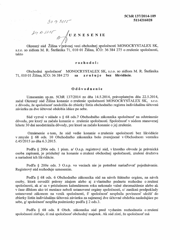 zatal Okresny stid Zilina konanie 0 zrusenie spoloénosti MONOCRYSTALEX SK, s.r.0.