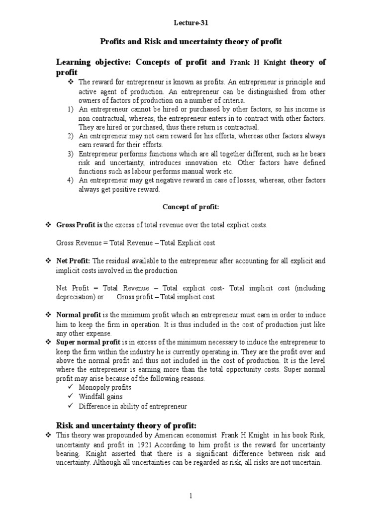 Learning objective: Concepts of profit and Frank H Knight theory of